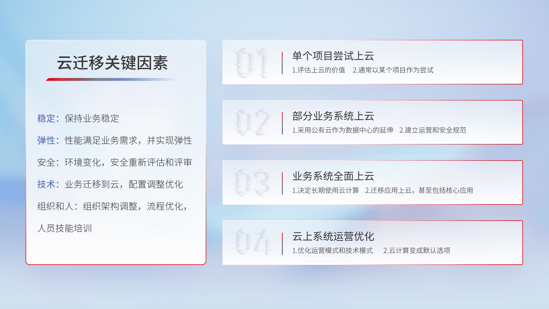 结合实际业务,,,从规划设计、、、、云平台选型、、、云原生改造、、、数据迁移、、、、集成交付,,迁移全过程为客户识别最佳上云路径,,,做好风险识别管理,,,设计网络架构、、、身份权限、、、、安全审计合规、、操作审计、、、日志审计、、监控告警策略、、、、多站点容灾设计等,,,对云上基础设施进行整体规划,,,提升IT治理水平,,,,以满足弹性、、、高可用、、高性能的需求。。。
